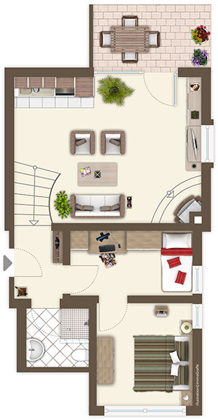 Schlafzimmer, Wohnzimmer mit gut ausgestatteter Küchenzeile